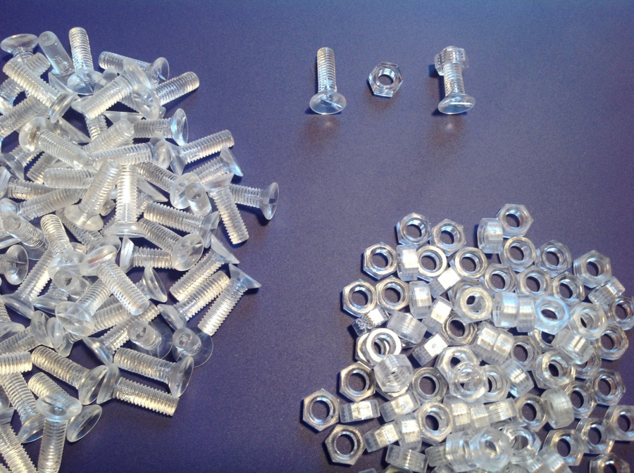 dazu transparente Schrauben und Muttern aus Polycarbonat, schlagfest und farblos