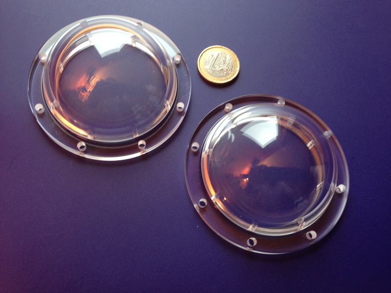 Lagerhaltig sind farblose 200, 300, 400 und 500 mm große Halbkugeln. Kleinere und größere Abmessungen sind als Sonderanfertigung jederzeit machbar. Die kleinste war bisher 66mm, die größte 1.850mm.