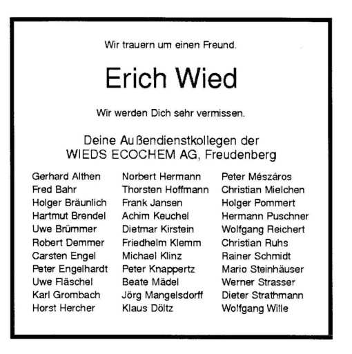 28.10.2008: Für Erich Wied hatten wir eine Todesanzeige in der lokalen Siegener Zeitung und einen Kranz (von dem es leider kein Bild gibt).