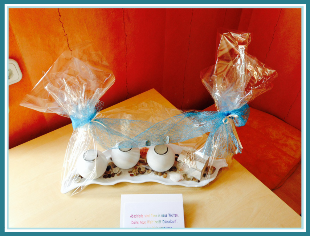 04.03.2013: Frau Linde hat zum "halben" Abschied ein "Tee-Tablett" (Tee-Gläser, Tee-Stäbe, 2 Teesorten) und einen Gutschein der City-Galerie bekommen.