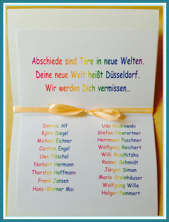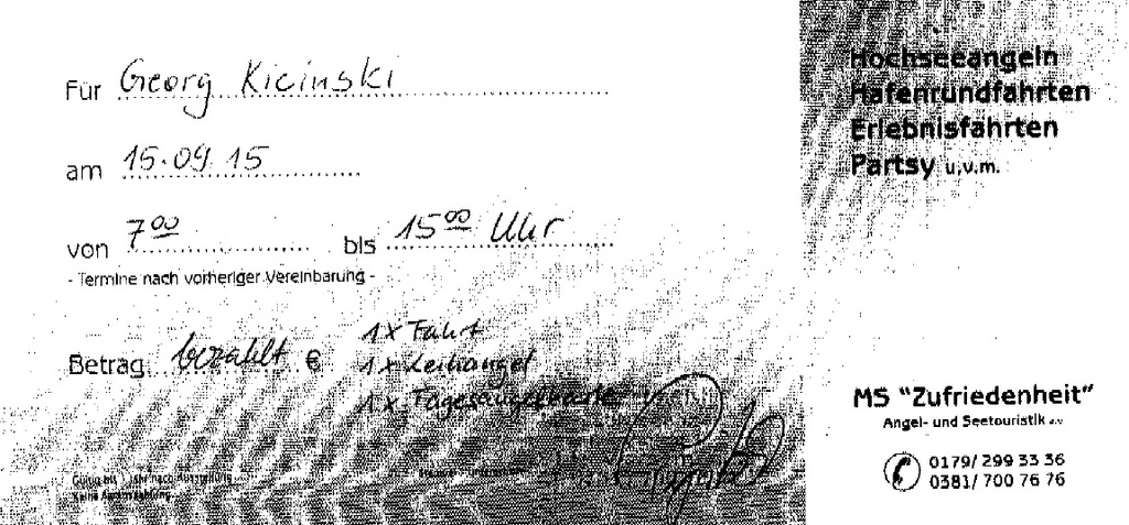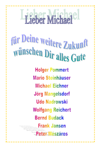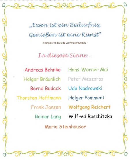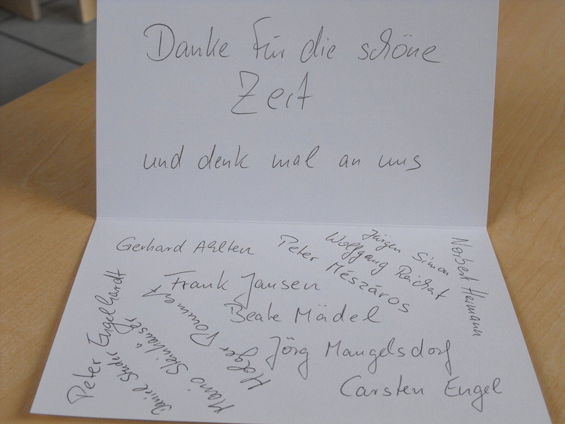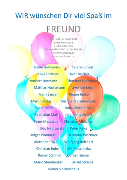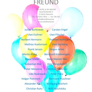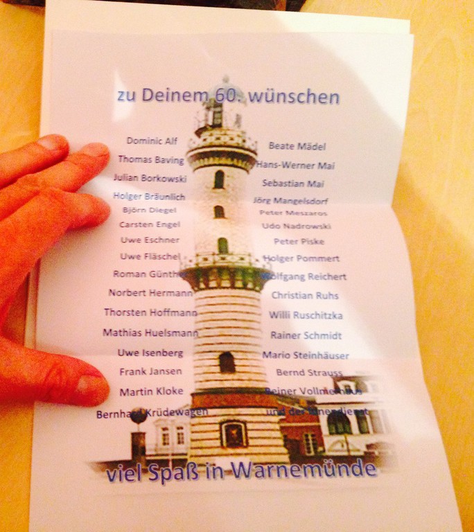 22.03.2015: Zum 60. Geburtstag von Georg haben wir richtig etwas zusammen bekommen. Mit dem Innendienst und den auf der Karte aufgeführten ADM´s kamen 4 Übernachtungen im Hotel Hübner in Warnemünde samt Wellnesspaket und ein Gutschein für eine Runde Hochseeangeln zusammen.