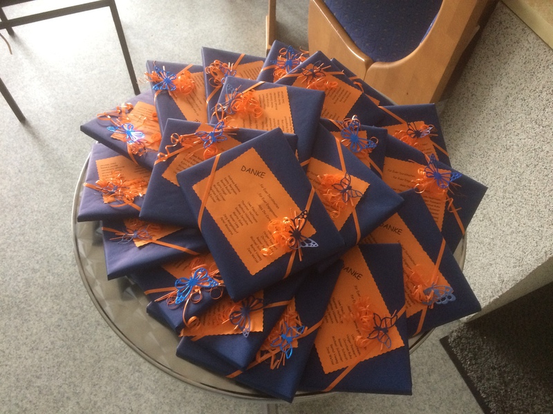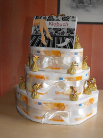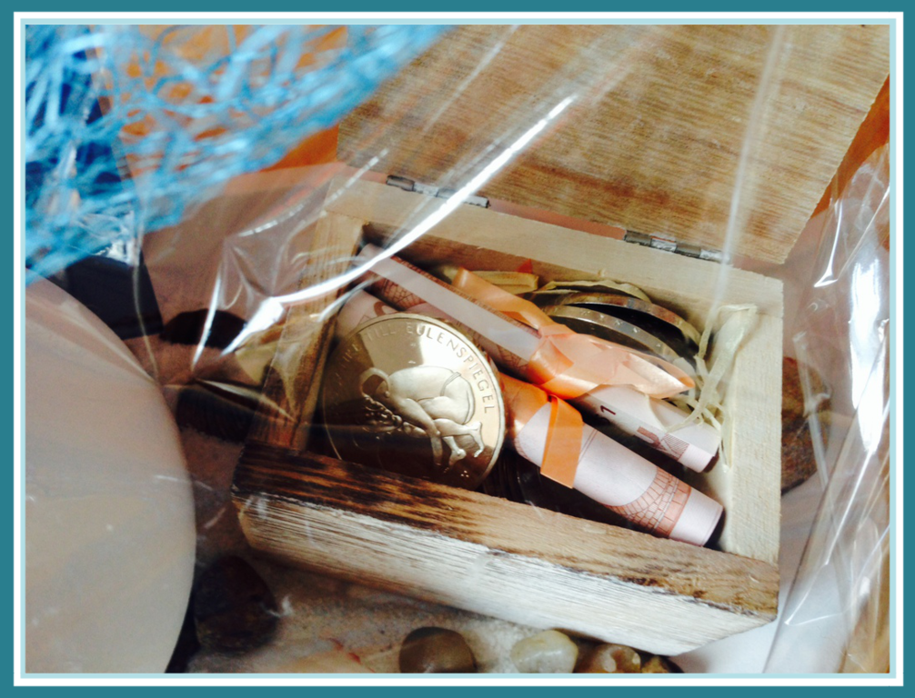 Wir haben eine schöne Deko mit einem Schatzkästchen, worin 14 glänzende 10-€ Gedenkmünzen und 2 Zehner als Scheine aufbewahrt sind, übergeben.