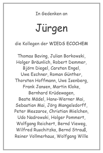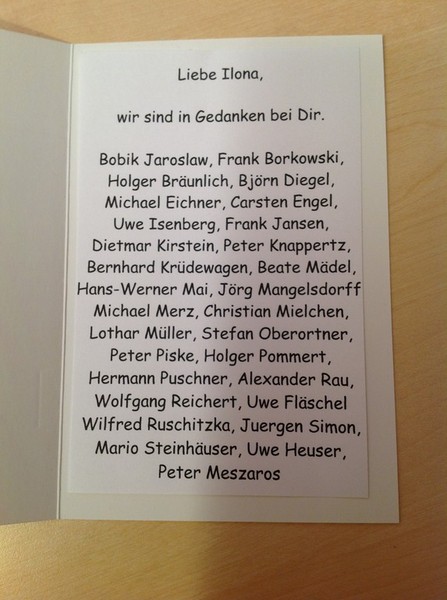 Die Trauerfeier fand am 02.07.2013 statt. Wir haben uns als Kollegen mit einem Grabgesteck und einem Geldbetrag daran beteiligt. Unsere Gedanken sind bei Ilona.