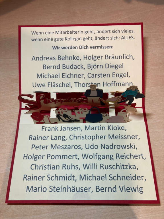 Diana hat uns auf eigenen Wunsch zum 30.09.2022 verlassen. Am 17.11.2022 habe ich Sie besucht und unser Geschenk überreicht. Hier gibt es ein paar Bilder dazu:
